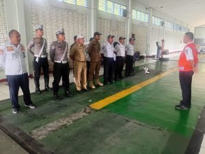 Petugas Dishub dan Tim Gabungan sedang apel sebelum memulai kegiatan pengawasan dan pemeriksaan kendaraan bermotor pada hari ini. yang dipimpin oleh Pak GITONO,S.E